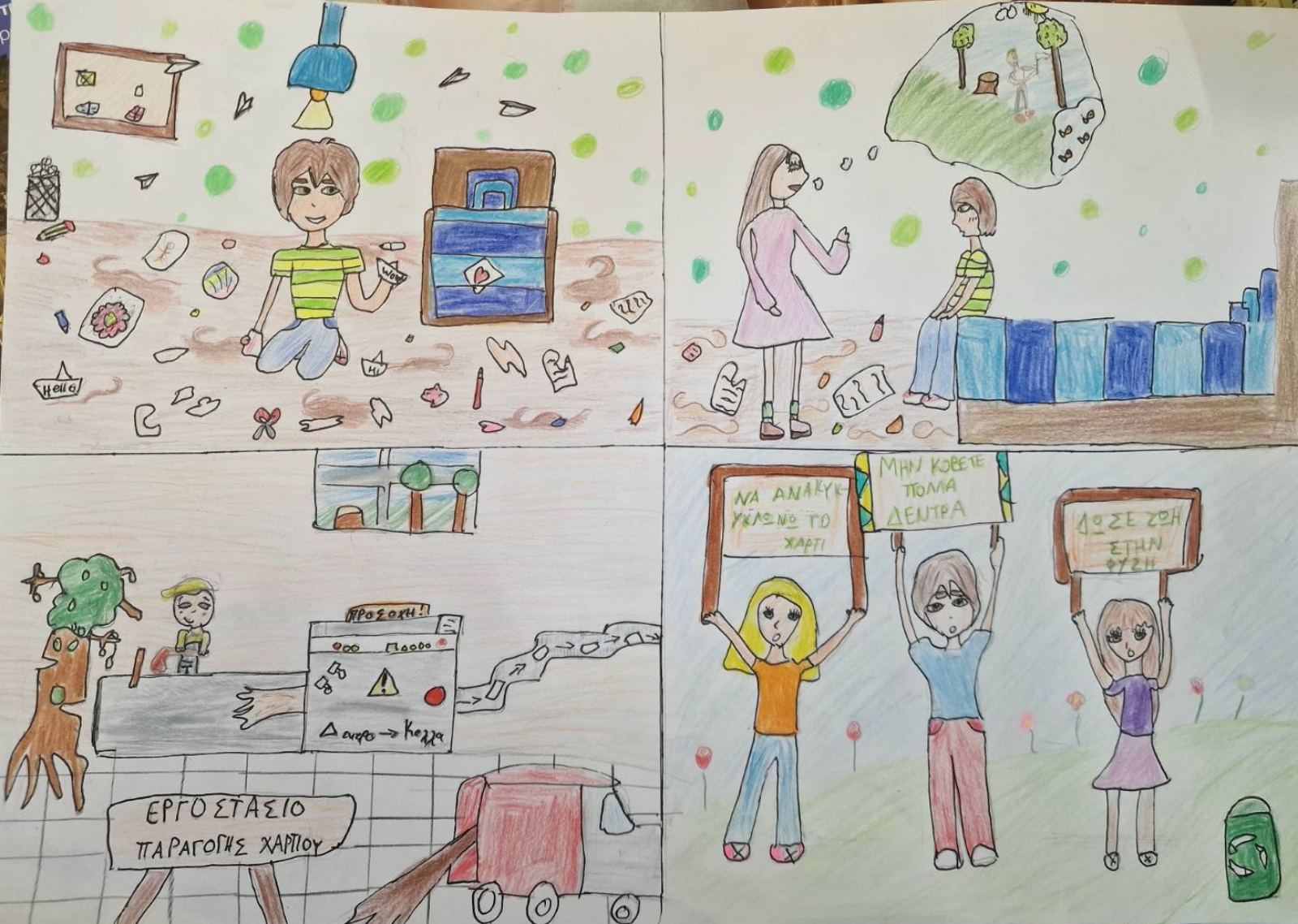 Μέσα από τη δημιουργία των έργων τους, τα παιδιά εκφράζουν τις σκέψεις και τις ευαισθησίες τους γύρω από τη σημασία των δασών και την προστασία του περιβάλλοντος. Με φαντασία και δημιουργικότητα, αξιοποιούν διάφορα υλικά και τεχνικές για να αποδώσουν μηνύματα που προάγουν την οικολογική συνείδηση και τον σεβασμό προς τη φύση.